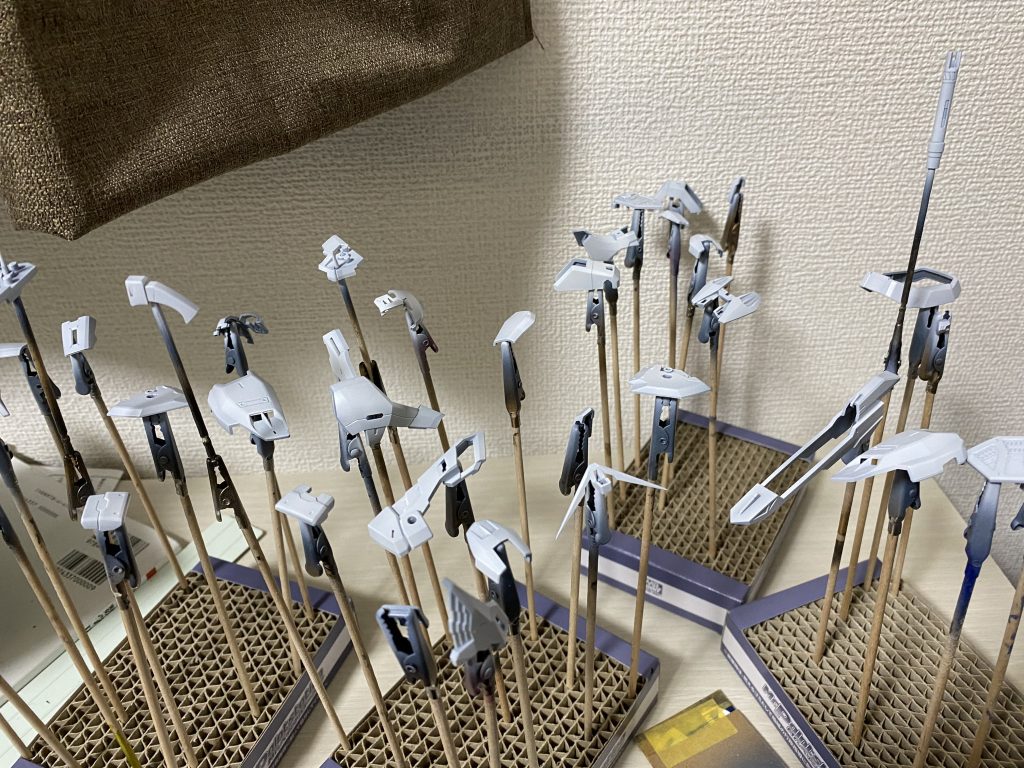 まずは下地に、白と黒、シアンとマゼンタを混ぜて作ったダークグレー、その上にExホワイトを塗り、そして最後にMrクリスタルカラーのムーンストーンパールを吹きました。キラキラしていい感じ。(写真だとわかりづらいかも)