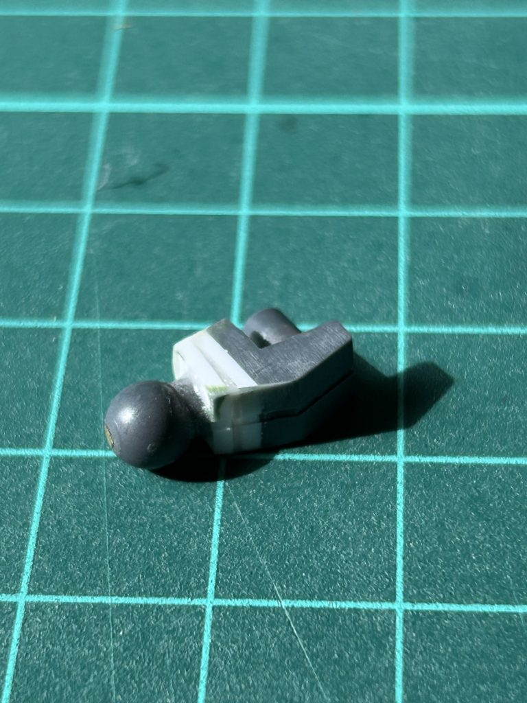 ジムスナⅡ、全体的なプロポーションは良好なんですが、足首周りの可動域がやたらと狭いのが気になりました。 狭いというか、肩幅程度の開脚でも実質アンクルアーマーに干渉していますw そこで、足首関節をプラ板で下駄を履かせて2mm延長してみました。 これでアンクルアーマーとの干渉も解消し、足首の設置性も随分と良くなります。 また、副次的に過去作の素ジム等と頭身が完璧に並びました(地味にこれが一番の狙い。)。 ちなみに、関節部の延長は強度不足に陥りやすいので、1.0mmの真鍮線をボールジョイントの中心に通して補強しています。 こうした可動箇所を加工する際は、流し込み接着剤は×です。 瞬着+プラリペアでガッチリさせておかないと、後で泣きを見ることに…(←実際、泣きを見たので覚書)