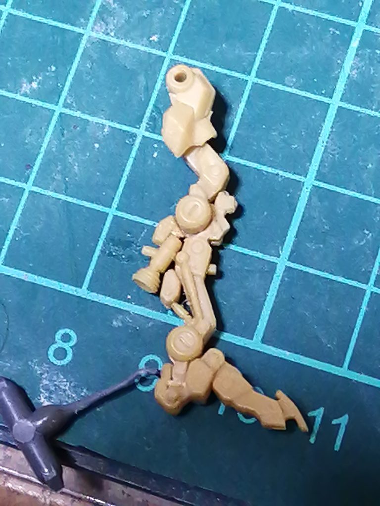 元々足首と踵は稼働してたので、足首の横スイングと膝関節、股関節を作る訳ですが、膝は予想通りダボがそのまま使えました。そして腿のダボでも関節を作れたので正座が出来ますw