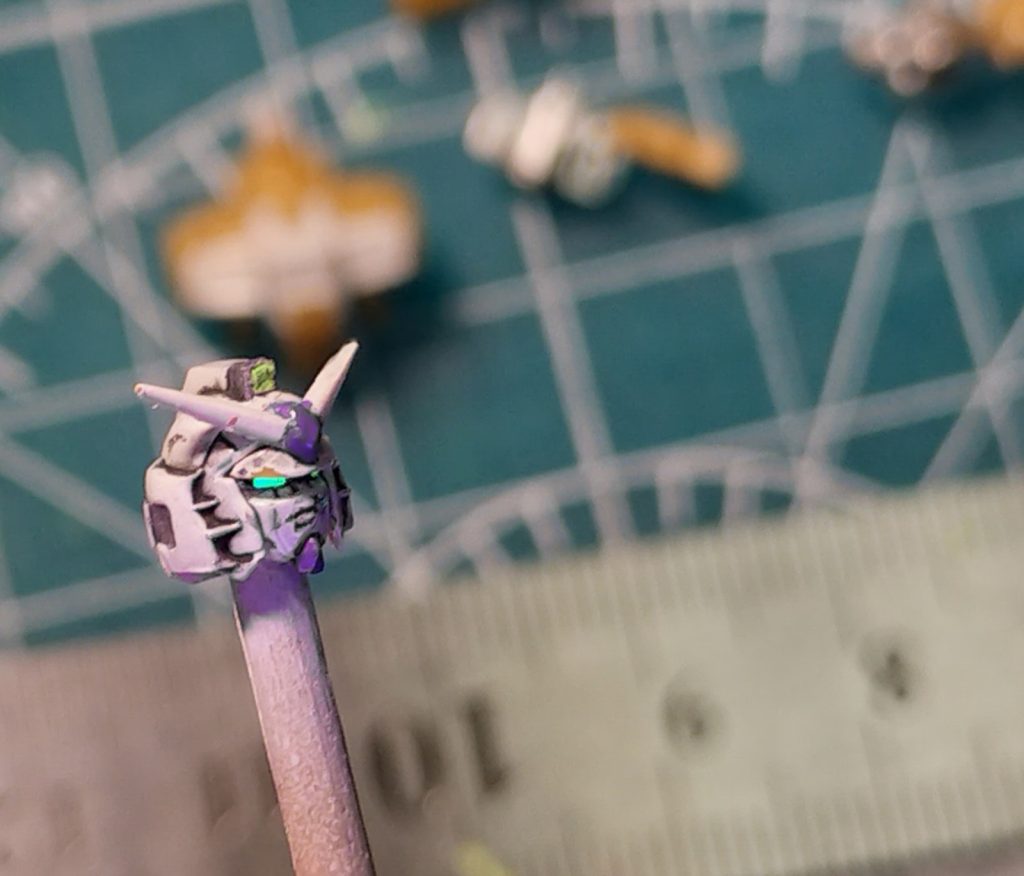 ツインアイは塗るの大変なんで、白いマスキングテープにガンマカ蛍光グリーンを塗ったうえで長方形にデザインナイフで切り出して、ピンセットで貼り付けています。