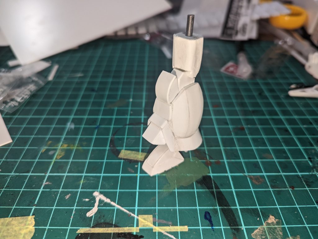 プラ板工作練習 苦手なパテをなるべく使わずプラ板で曲面制作の試行錯誤中です… 脚部はプラモのパーツの中でも大きく、曲面が組み合わさったデザインで難しい(ꏿ﹏ꏿ;) ジオン系機体を工作する上で、曲面がある程度自由に作れるようにならないと作品の幅が広がらないので、色々な方の情報を参考にプラ板工作修行中です。 画像は箱組なので、積層のように削り出して形状出すよりは左右対称に製作できて良さそうかな? (あと軽いのも嬉しい) 膝2重関節&足首関節&爪先関節が可動するため、可動はそこそこ良好( ╹▽╹ ) 肩部バインダーが入る分、相対的に太腿が小さくなりすぎないようゴツく作り直した結果、今度は足が小さくなってしまったので、作り直す予定です。 やっぱり面倒でも全体の大まかなスケッチ作ってから製作しないと、二度手間になって結局工程増えますねorz 今回は流石に完成させる自信がないので、まだ何作っているのかは伏せますが、マンガでの登場コマ数少ないので細かいデザインが解らぬ(´・ω・`)