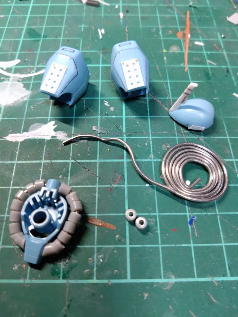 皆さんお疲れ様です。 今日は昨日できなかったグフカスタムの続きです。 少しずつディティール進めたり仮組みでどうするか悩んだりしていると前に制作して仮で着けたブレードアンテナが紛失!😨 探しても見つからず…あきらめて3本目の制作。 3本目となると段々形も変化してきました。 そして仮組みして外すときに動力パイプが外れてしまいました。😨 パイプの中はスプリングを使用しましたがパイプのうねり等も表現できないしギリギリの長さでカットしたスプリングを収めるのは難しいです。 さぁどうしようかと調べてみるとハンダを使用ってチラッとみかけてハンダなら柔らかくて丁度良さそう! でハンダ使用でやり直ししたものがメイン写真になります。 スプリングよりも断然制作しやすかったです。😄 そして頭部パーツのモノアイ基部はまた外すので着けずに仮組みしてみると…このパーツ無しで中にモノアイ仕込んだら? って思いましたが、それだと固定式になるので試しに100均で買った薄いペラペラのプラ板。 これをモノアイ基部位の幅で切り出して色々試して最終的に8mmの丸軸ドリルの刃に巻き付けて速乾流し込み接着剤で接着。(3枚目) 硬化したら外して輪切りにした3mm丸棒(解りやすくマッキーで赤くしてます)、100均購入してある釣具のリング、コレを丸棒の周りに接着。頭部パーツに組み込んでみたのが最後の写真です。 仮制作なのでもう少し煮詰めますが良さそうです。 モノアイ基部パーツよりも薄いのでモノアイを少し厚くできるのでリングを入れれました。 もう少し上側にモノアイ寄せても良さそうですね。 リング入れると少し大きいかな? リング無しなら違和感も無くて大丈夫だと思います。 下側に突起を設ければ多分左右に可動も大丈夫だと思います。 一応まだ仮制作段階ですが 皆さんどうでかょうか? コメントよろしくお願いします。🙇