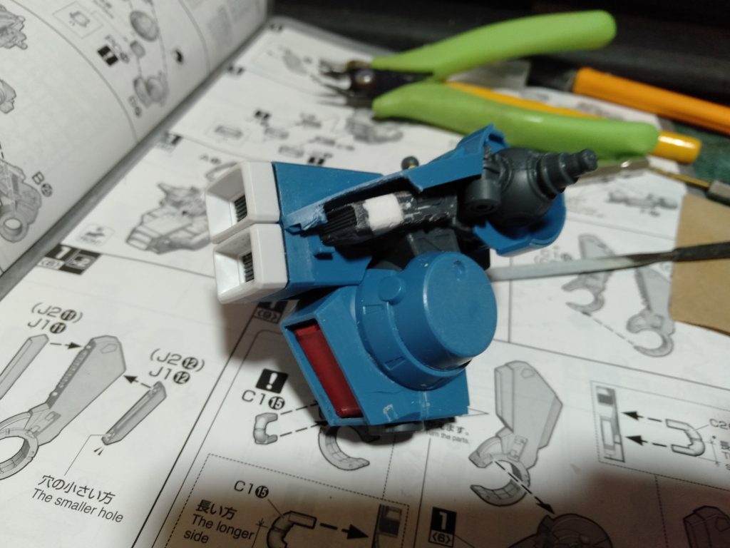 あと判り難いですが、コクピット左側面に作業兼緊急用の開閉ディバイス風にモールドを付け、腹部の円柱?部分の側面の凹みがイマイチでしたので、ココもモールドを追加しました。