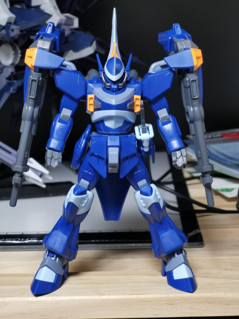そのままでもいい感じですが、20年前のキットなので最新HG風のスタイルに改修。通常は塗装前提の延長工作で足長にするところですが、「無塗装」でもいけるように「削る」ことで相対的に足長・良スタイルにチャレンジしています。