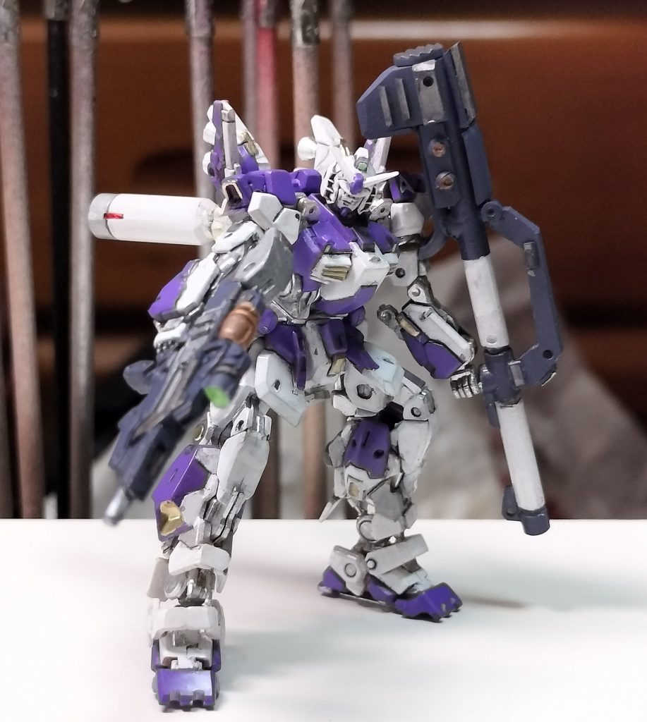 - パープルはガンマカアドバンスセットのものです。塗装はサフなしでほぼガンマカエアブラシ+充電式ハンディコンプレッサ(室内で段ボール箱にクシャ紙を突っ込んだだけの簡易塗装ブース)、一部MR.h-mkrメタリック系と、4アーティストマーカー(特にメッキな金色)で、ビン塗料の筆塗りはしていません。