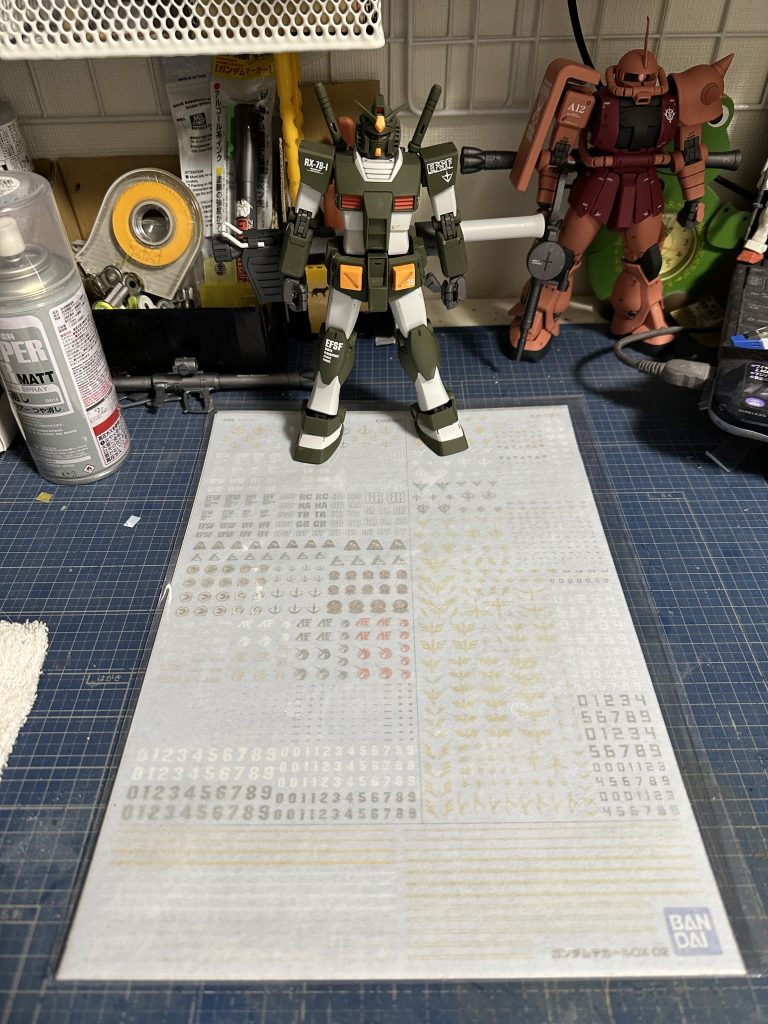 前面はどうするべか?、、、と思っていたら、以前、プレミアムバンダイでポチっていたガンダムデカールDX(連邦MGモデル用)があったので、ちょいと確認してみますと、コーションデカールもそれなりにある、、、ってなワケで、これを前面にペタペタしていけば良いかー、、、と思っているうちに、かなりの時間が経過。翌朝からの仕事がヤバくなるので、前面コーションは次回に持ち越しです。