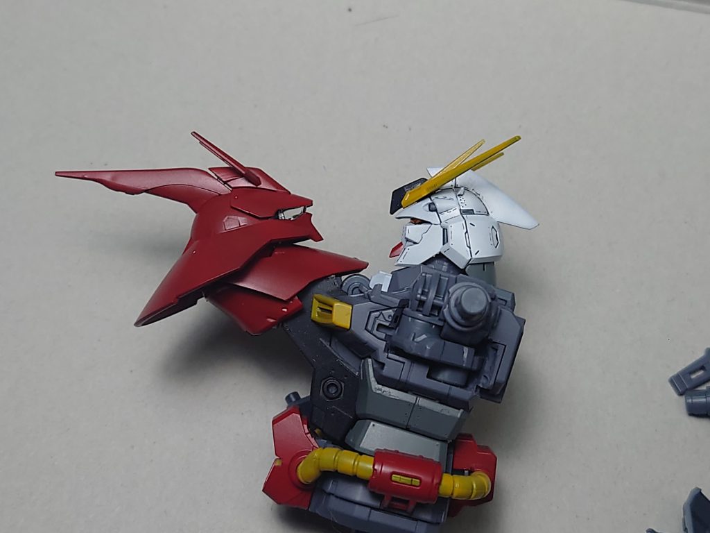 近接で撮ると対面図のような機体。今回の特徴でもあるサザビーの生きた頭部w 計画時には、元ネタのような貼り着いたデカイ頭部も候補にありましたが、オーバースケールと言っても1/100かSDしかないので、RG1/144をそのまま採用して統一感とコクピットがちゃんとあるところに意味を持たせてます。あと胴体もサザビーのハイメガ粒子砲が綺麗に接続出来たので、下半身との繋がりが簡単でしたね(*´▽`*)