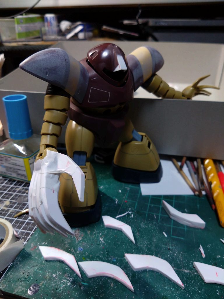 ape100 2024.06/01更新 MSM-03 GOGG 40 36 いいねしたモデラー(36) 12 作品を共有 病み上がりなので久しぶりの休みに感じます。今週は長かった…。😨 まだ本調子ではないですが久しぶりに昨晩、1mmプラ板切り出して3枚重ねて接着して爪の形に。 形の近いもの同士の二組を瞬間接着剤で仮付けして形を整えました。 それを本数分…初めての試みですが上手くいくのか? まだまだ削りで整えますが先ずはイメージ先行でマスキングテープで仮付けしてみました。 大きさは良さそうです。😄 可動はあきらめて接着するかなぁ?と考え中。 制作中 コメント コメントをして応援しよう コメントにはログインが必要です Sont@ 2年前 デカいは正義!水泳部独特の異形感、怪獣感みたいなものがアップして良いですね😆 お体、無理なさらず制作楽しんで下さいね~😄 ape100 2年前 ありがとうございます。🙇 少しずつやってみます。😄 TOMSIM 2年前 まだ本調子ではないのですか。やはりちょっと怖いですね。インフルもですが。 爪ですが、このサイズだと可動入れた方が良いかもです。もしくはいかにも可動しそうなくらいしっかりディテールを入れた方が良いですね。この本数に可動入れるのは大変過ぎるので、しっかりディテール入れる方がお勧めですけども。 ape100 2年前 コメントありがとうございます。 可動できそうな大きさですが少し面倒だなってのもありました。 ディティールは良さそうですね。 爪の仕上げに時間かかるので何か考えながらやってみます。😄 みずかトモカサ 2年前 お疲れ様です😊 巨大なオテテ!😃 迫力がアッて良い雰囲気です🤗 ape100 2年前 ありがとうございます。 やはり大きいほうが良さそうですね。😄 しろ 2年前 あいやー!ape100さんも病み上がりなンスね!汗 !!ヽ(゚д゚ヽ)(ノ゚д゚)ノ!! 早く元気ニナァ~レ! 凶悪なツメですねー! 完成ではハンマーキャッチも見られるンスかねー(汗 ape100 2年前 そうなんですよ病み上がりで集中が続かなかったり、やる気が出なかったりです。 ハンマーキャッチはやはり避けられないのか。😄 ハンマーどうしようかなぁ。🤔 yuubi 2年前 凄い迫力ですね✨ ハンマー受け止めではなく 叩き落とす‼️ってシーンが見れそう😊 ape100 2年前 コメントありがとうございます。 爪を研ぐのが時間掛かりそうですが少しずつ頑張ります。😄 meg-ocero 2年前 おお!迫力出ますねぇ😆 ガンプラはついつい熱中しちゃいますが、お体無理せずに😅 ape100 2年前 ありがとうございます。 時間かかりそうですが少しずつやります。🙇 ape100 子供のころからガンプラ好きです。 難しいことはできないので自己満足で楽しんでます。 ファーストガンダム好きですが最近の作品も映像が素晴らしくて好きです。 美プラ沼にも浸かっております。 変な作品もありますが私の作品気に入ったら気軽にコメント、フォローお願いします。 沢山の素晴らしい作品を見て自分の技術のレベルアップをしたいです。 よろしくお願いします。🙇 ape100さんがお薦めする作品 歴戦グフカスタム寒冷地仕様 ガトリングガンランス装備 セイラ & Gファイター パーフェクトジオング バルバトス ルプス ディアボロス 5 チョコサプ ガンキャノン 紅組なのでガンキャノン。 紅組に少し貢献する為簡単塗装で間に… 9 MIGHTY STRIKE FREEDOM GUNDAM 今年も昨年同様の紅組にしましたが年末の仕事が忙しくて疲れもあ… 17 パーフェクトジオング 制作途中はずっと投稿してましたが完成したのはオラザクに投稿し… 15 バルバトス ルプス ディアボロス MGバルバトスが完成しました。 今回は筆塗りで派手にウェザリ… ape100さんのページ この作品をお薦め作品に設定する Please login to update your profile! Please login to update your profile! Please login to update your profile! Please login to update your profile!