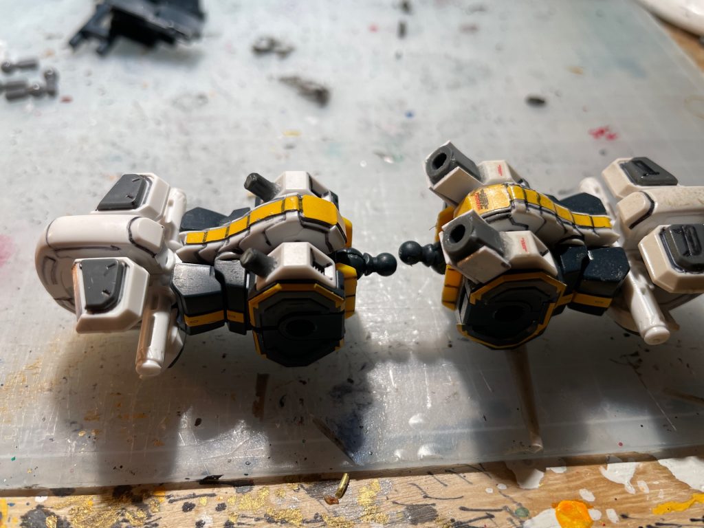アトラスガンダム2機の上半身どうしを段差接続、一方をバックパックにするのがフルアーマー化の最大ポイント。余っていたPCジョイントとそれに合うランナーを切ってそれぞれ真鍮線プラス瞬間接着剤で固めて2点支持で大型武装バックパックを支える作戦です。荷重に耐えれるか心配でしたがなんとか持ち堪えてるようです。