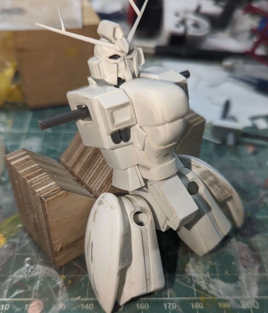 サイドの装甲は内部にスラスターを組み込む関係上、大腿部と別で制作し、マスキングテープ噛ませながら瞬間パテで隙間埋めしてほぼピッタリサイズになるよう工夫しました。