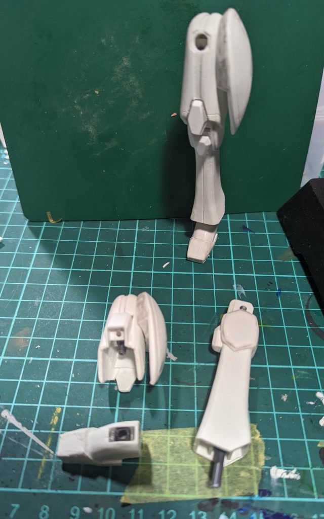 膝部分の形状は原作デザインと違いますが、試行錯誤中に自分の中で割としっくりきてしまったのでこのままで行く予定です。どうせ頭部形状もデザイン再現度<見栄えの良さで、若干形状違うので、再現度より自己満足度優先で制作しています。