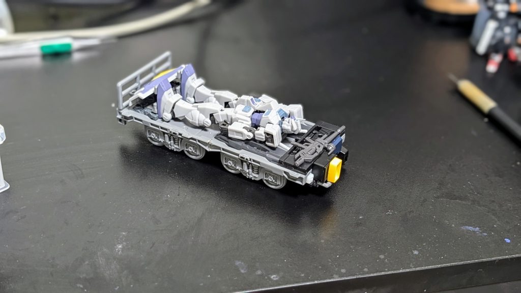 そしてガンダムと言ったら用意しなければならないのはガンダムトレーラーでしょう💡ここまで可動するフィギュアを手に入れたのだから作るしかありません!ということで100均の山田化学さんの商品の力を借りました💪トレーラーの本体は貨物列車の幅を詰めて、あとは適当にジャンクパーツでそれらしく!運転席がかなり雑ですが、雰囲気が出てればヨシッ👍
