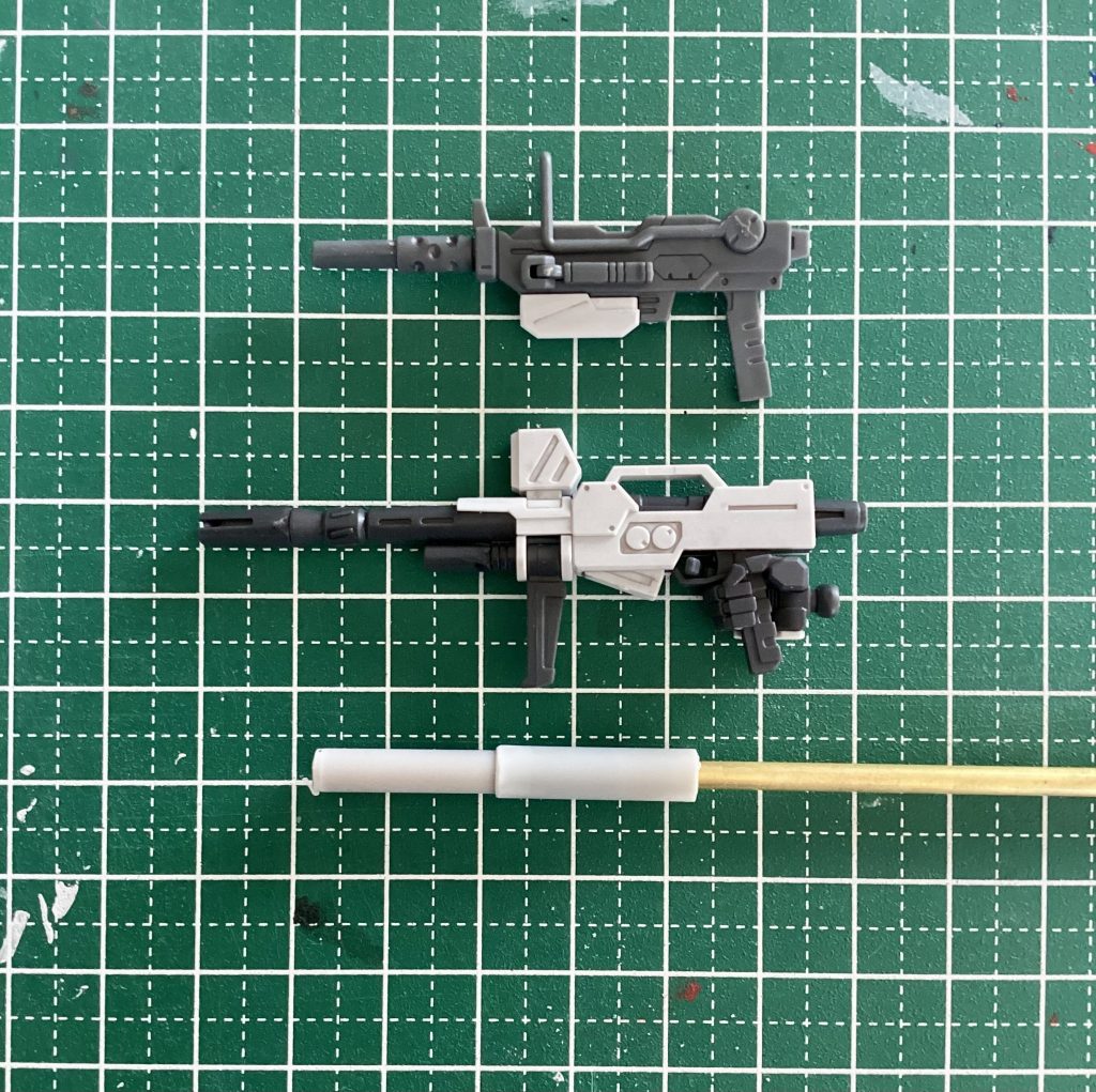 キット付属の100mmマシンガンは本体に比べてやや小ぶりな印象で、ベースにするにはボリューム不足だなぁと思っていたんですが、ふと目についたビームライフルの本体基部が、厚さ・長さ・四角感いずれもバッチリだっのでコチラをベースにすることにしました。