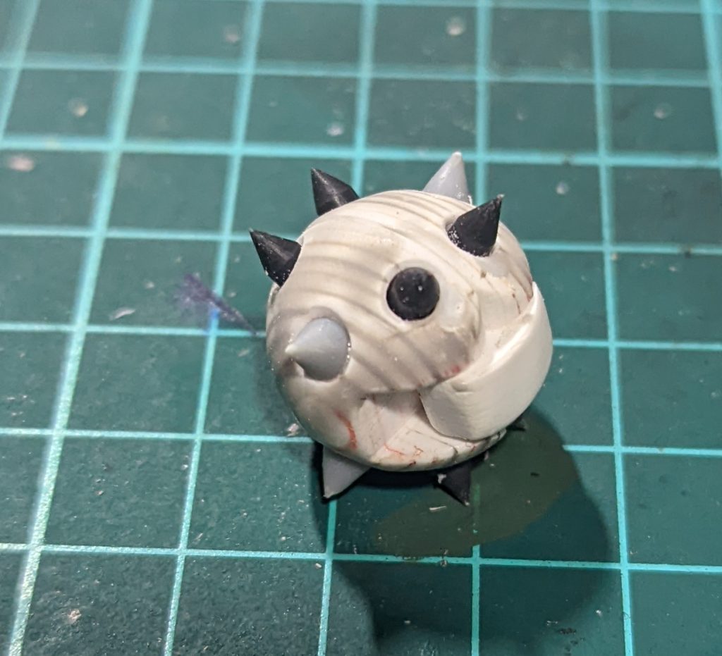 ①で制作したアマクサのハンマーの基部にスパイクを追加しました。半球の上部と淵でスパイクのサイズが違うようなので、薄いグレーのスパイクは4mmプラ棒から、濃いグレーのスパイクは3mmのランナーから削り出しました。