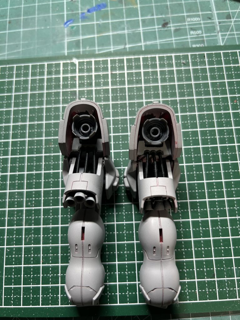 バーニアの下にプラ板で工作したパーツと二の腕ガードに内臓されてる3連バーニアをスプリングで繋げました。このバーニアってどっからエネルギー供給されてるのか謎だったのでこういう解釈になりました。