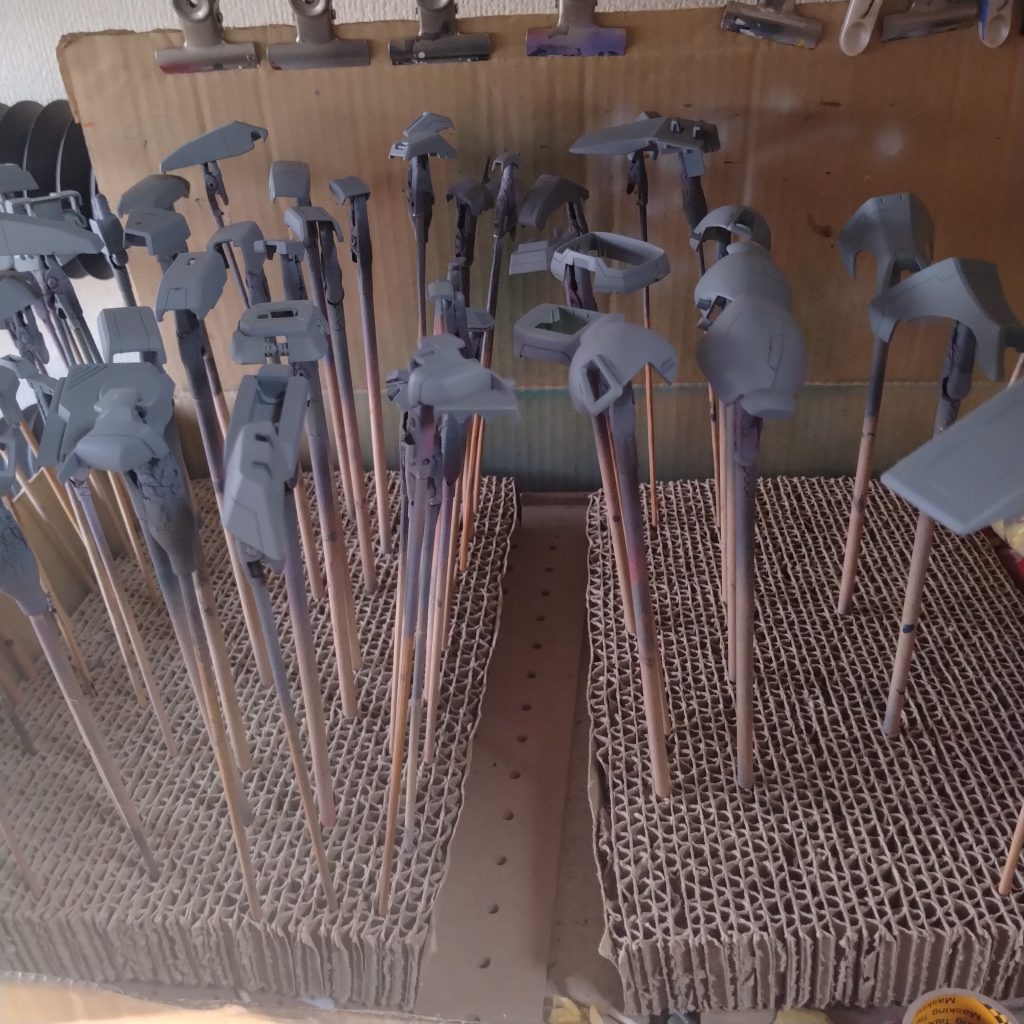 取り敢えず!メイン外装のサフ吹かしました!(笑)今回はなるべく製作中の過程を映して行こうと思います!忘れるかも知れないですが!(笑)ちなみに私が使用してるハンドピースは上からタミヤのスーパーファイン0.2.中がクレオスのプラチナ0.3でビューティー4の0.3なのですが!ビューティー4はニードル変えて0.5並の噴射するようにイジってますので!デカい物をやる時以外は出番が滅多にありません!(笑)コンプレッサーは昔からタミヤを長年使っていたのですが!去年からV1コンプレッサーに予備タンクを繋いで使用してます!(笑)塗装ブースはタミヤの、ツインを使ってますが!手入れが面倒臭すぎるので!塗装ブース変えたいのですが!条件に合うものがなかなか見つかりません!(泣)引き続き本日は塗装やっていきますので!又投稿します!