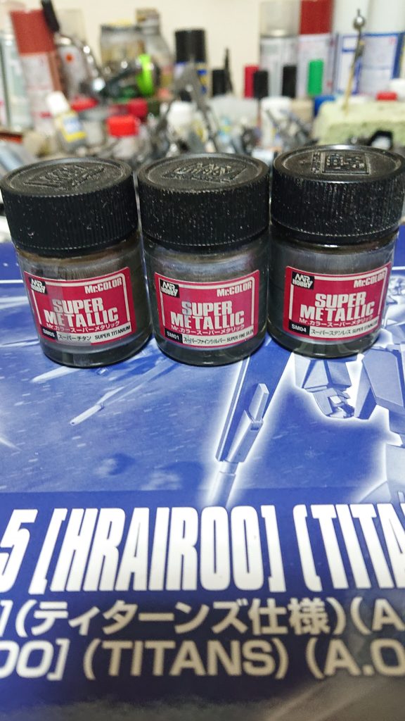 最近は関節、フレーム、バーニア、武装なんかは下地に黒吹いてからクレオスのスーパーメタリック(SM)のスーパーチタン、スーパーファインシルバー、スーパーステンレスで部位ごとに塗り分けるのがマイブームです。