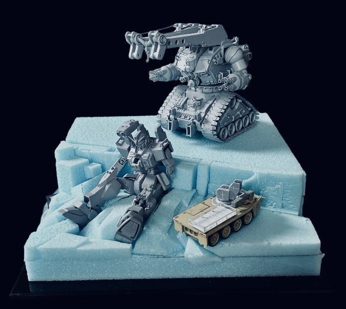 先日購入した台座の上に切り出したスタイロフォームを並べてジオラマベースの下地調整と配置確認中です。限られたスペースで牽引ワイヤーが丁度ガンダムの両肩直上に来る様、両機の位置を微調整しつつ手前の高所作業車のスペースをどう確保するか?またガンダムの埋もれ具合も確認中です。ジオラマの設定としては中破し窪地で埋もれて擱座した陸ガンをベルゲガンタンクが開けた平地に引き上げその後ろで待機してるトレーラーに積み込もうとしている状況です。高所作業車で陸ガンの肩に乗り移った作業員が牽引フックを取り付ける作業中…といった感じです。なかなか納得出来ないです…高所作業車は思い付いたらまた少しづつ手を加えています。今回は天井のハッチを作り変えてセンサー感知式自動チェーンガンを取り付けてみした。映画「武器よさらば」に登場する兵員輸送車を参考にしました。米軍のストライカー兵員輸送車と感じが似てますね…最近は絵の様に神風ドローン対策としてドローン迎撃用に改修された物も配備されているそうです。こんな感じで陸ガン武装だきたらさぞかしカッコいいでしょうね(≧∇≦)