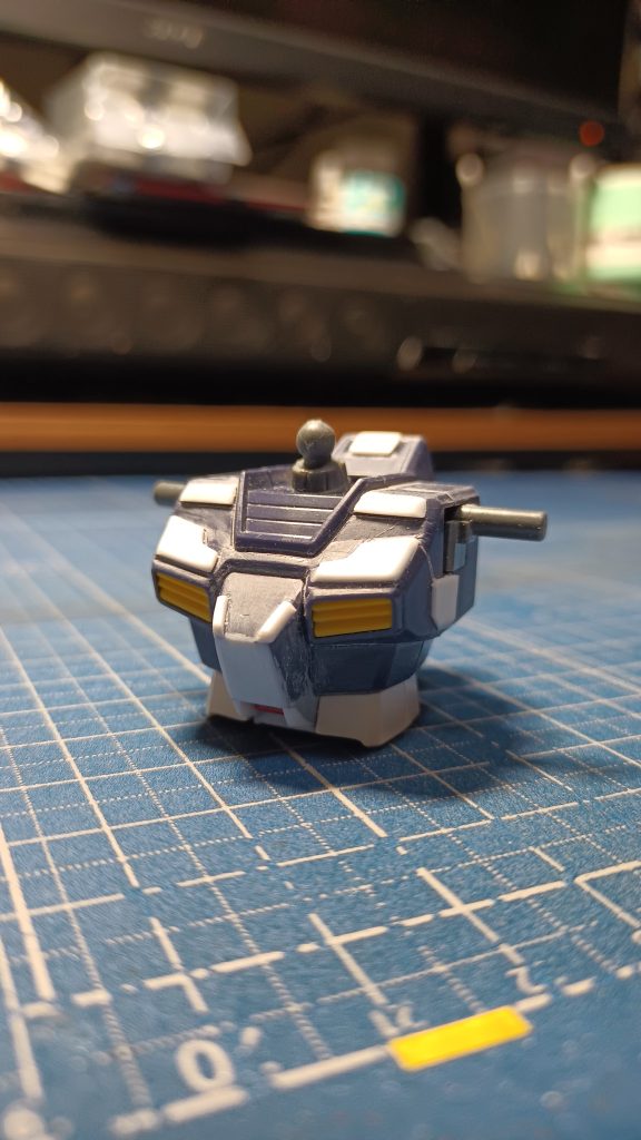 このジムに張り付けたプラ板は結構小さく切り出したので目標の大きさに近いサイズに切り出してニッパーで目標の形に切り出してます。胸部の左右対称のパーツを切り出す時は近いサイズにした厚めのプラ板を少しの接着剤で貼り合わせてニッパーで切り出してカッターで貼り合わせた所を剥いでヤスリで削って面を整えて張り付けてます。