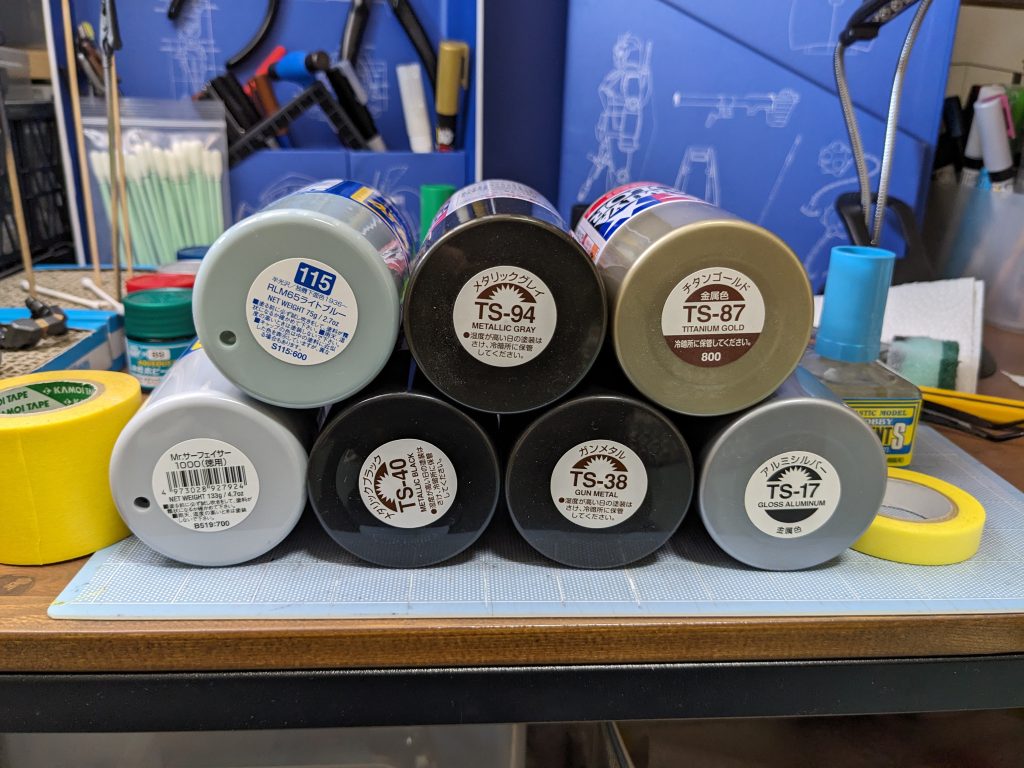 盆休みから始めたメガサイズガンダムも、いよいよ完成間近になりました。今回、成形色をなるべく残すことを考えて作成してます。だいたい80〜85?90%程度残ってるんじゃないでしょうか。それでも使用した塗料を記録として残したいと思います。缶スプレー:メタルブラック、ガンメタ、メタリックグレー、チタンゴールド、アルミシルバー、ライトブルー、グレーサフ、艶消しトップコート。水性塗料:焼鉄色、シルバー、ゴールド、メタリックレッド、メタリックグリーン。ガンダムマーカー:ゴールド、シャインシルバー。RTマーカー:ブラウン1、グレー2、ブルー1、レッド1。書き起こしてみると沢山使ってますね。サフはいい色してたので下地じゃなくて仕上げとして使ってます。