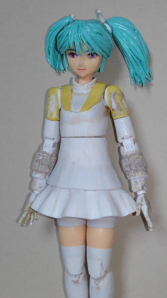 髪の毛は掘り直した方が良さそうなところがありますね。塗膜が乾いたら掘り直したりヤスリ掛けして再塗装して完成です。塗装はガイアのミクカラーですw クエスはもうちょっと青いかもなんですが、青でフィルタリングと言うかスミ入れすればもう少し暗くなるのでやってみようと思います。