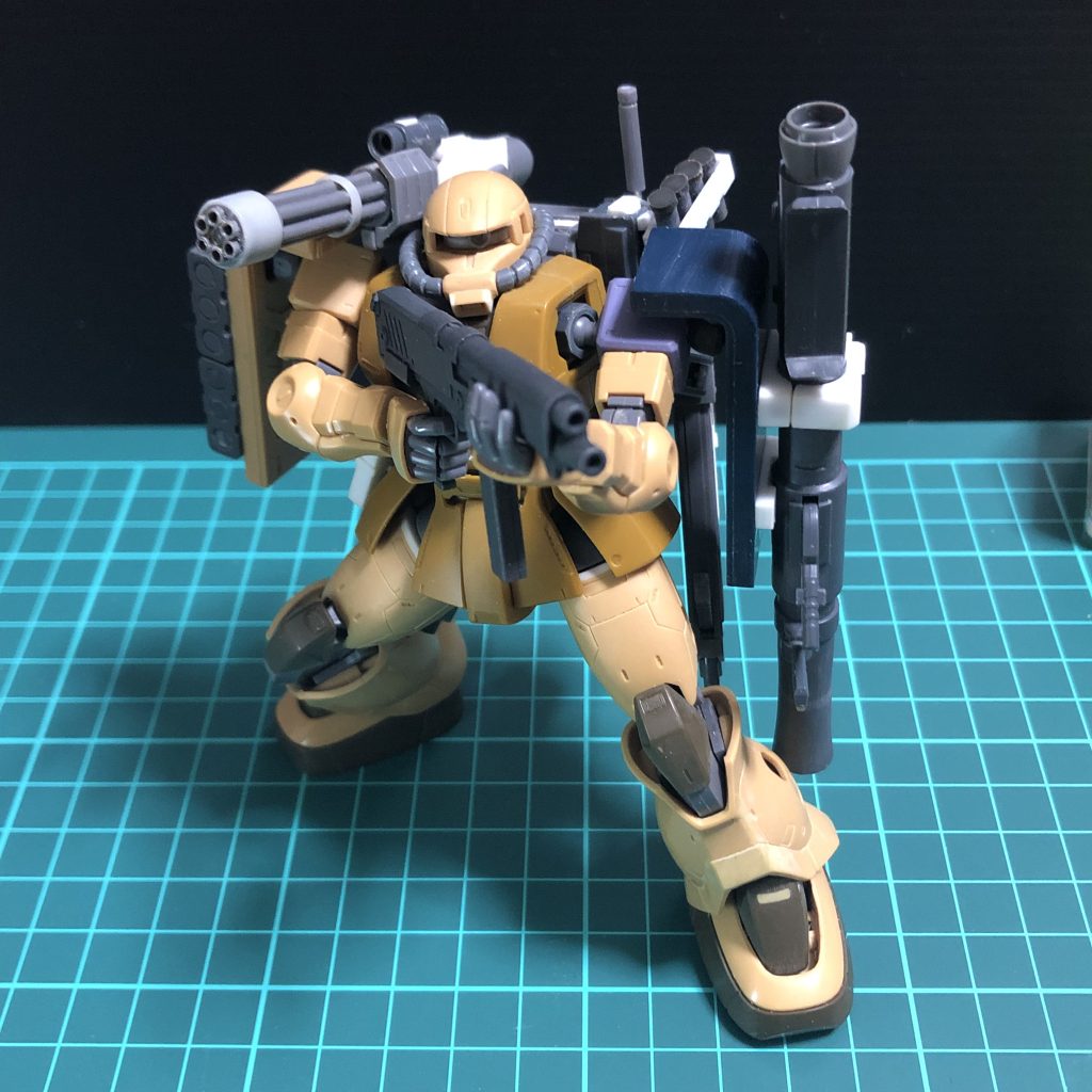 変更点は、シールドのバズーカマウントを骨組みぽいのから挟み込むタイプのマウントに変更、ビッグガンの接続アームをキットのものからパワードアームズパワーダーのサブアームの関節に変更、バックパックの左側に通信装置とスモークを追加、バックパックの上面にダクト追加、手持ち武器のMMP-80変更にあたりドムトローペンについてるような予備マガジン追加など…