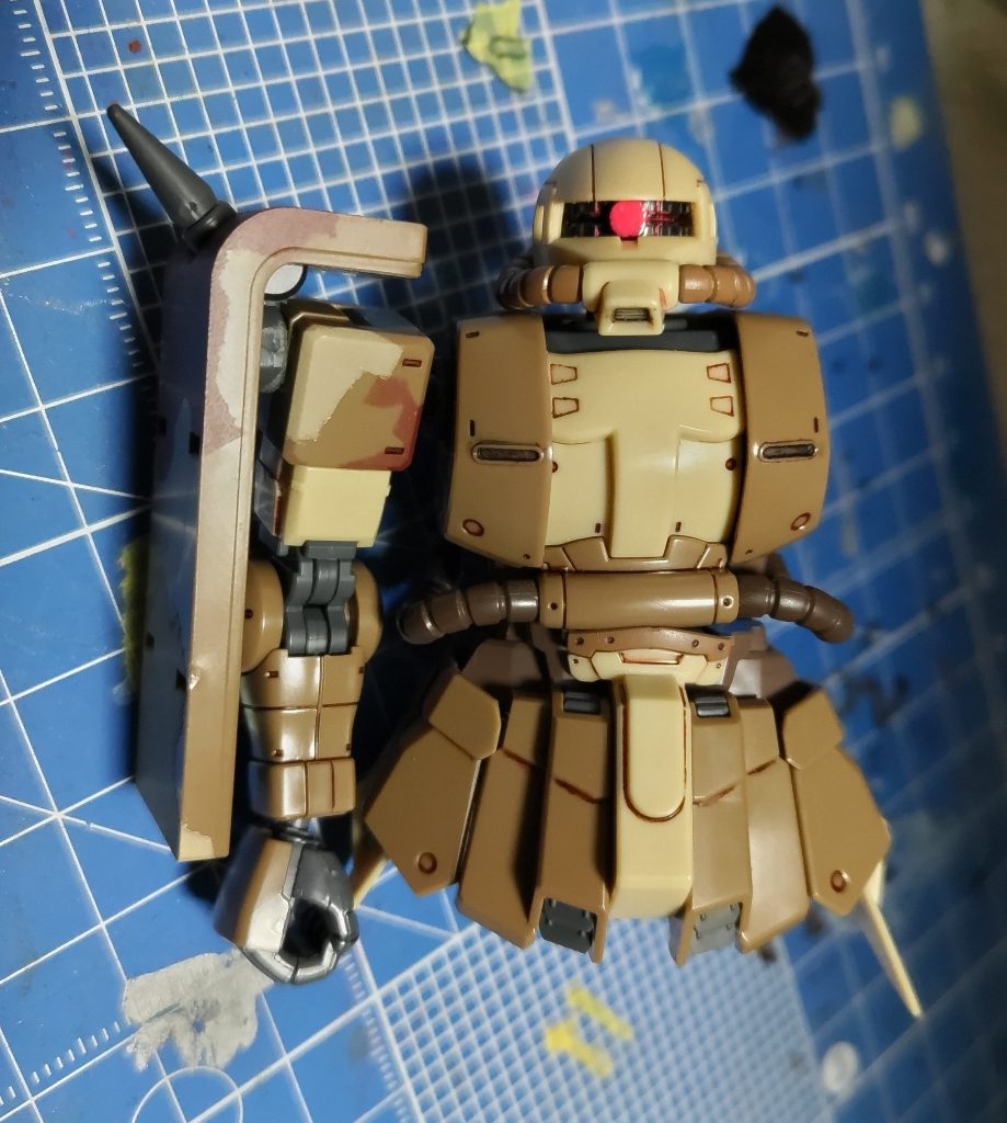 最初にシールドに艦底色を使ったので、両肩もタンと艦底色使いますが、足の迷彩にはマカボニーを使ってみますー。
