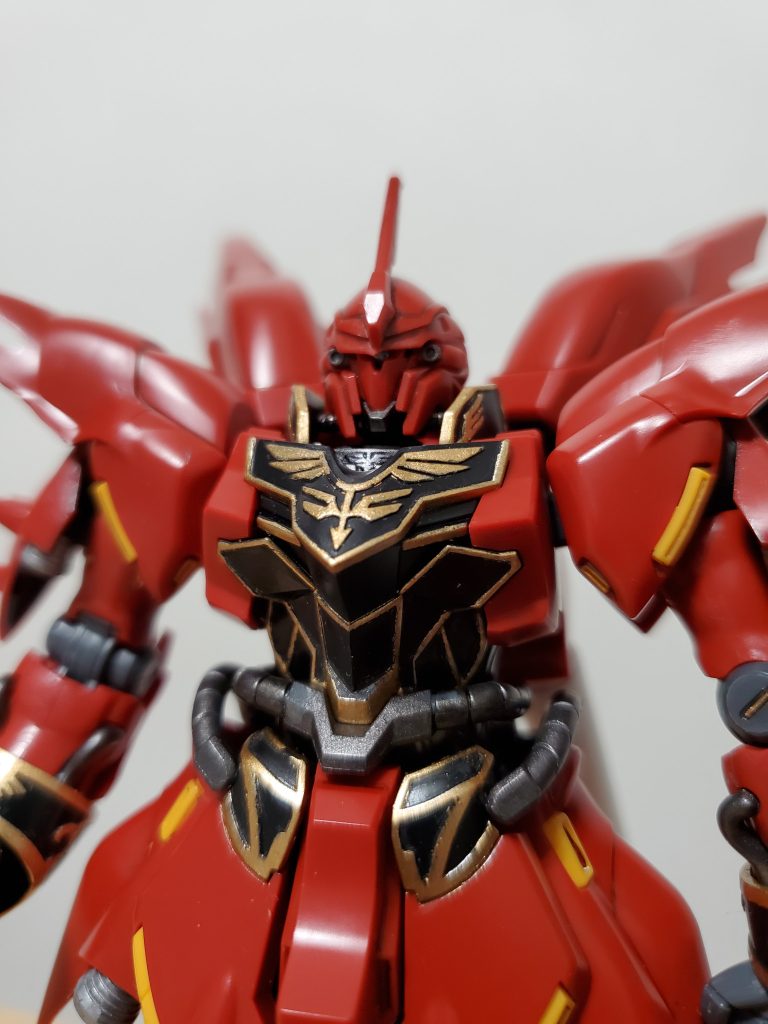 襟、袖、腰前部、胴体の上のネオ・ジオンの大きなエンブレムは比較的短時間でキレイに色乗せれたんだけど…