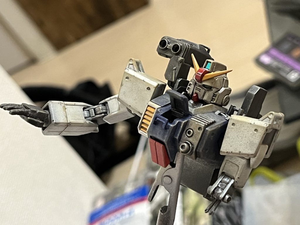 連邦モビルスーツの金属感がある白ともシルバーとも付かない微妙な色を出せたらと「ガンダム」を塗装する時にいつも思うのですがどうでしょう?「ガンダムホワイト」を塗装後「フラットブラック」で適度にチッピングを施し、「ダークブラウン」で墨入れ後、ウェザリングマスターの「チタン」を全体に薄っすらと載せ、その上から更に「スモークグレー」で薄っすらとフィルターをかけた後、ウェザリングマスターの「ライトサンド」「サンド」で汚し、最後に艶消しを吹いてます。すみません…訳わかんないですね…(๑•ૅㅁ•๑) それにしても陸戦型ガンダムカッコいい(*´∀`)♪