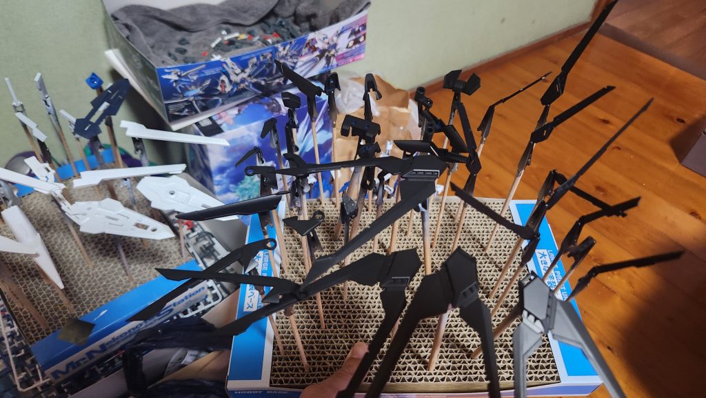 途中、作業効率を上げるために追加投資を行いドロッパーボトルでサフ調整の効率up!塗装中に水が混じってしまっていたのでフィルター装着し安定性向上!
