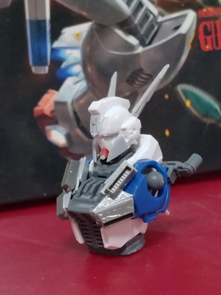 ブレードアンテナは暫定で、うさ耳あんまり好きじゃないけど、これにしないとハーディガンじゃないような。顎は伸ばして、への字ダクトは消しました。頬バルカンも取っ払い。まだ、兜は盛ると思います。