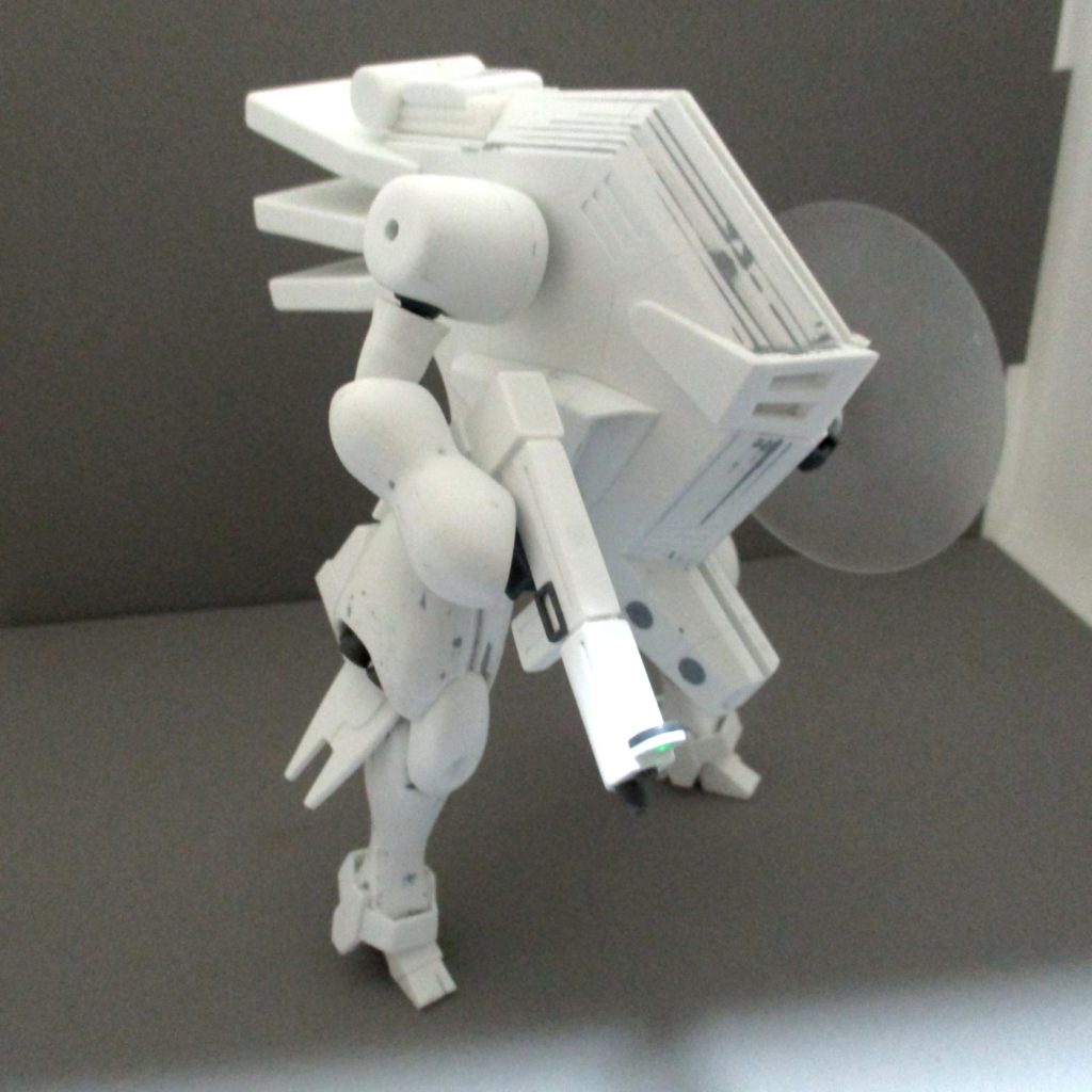 ・左腕にビームシールド装着。シールドは塩ビ製の下敷きから。ラッカー塗料が乗るかわからんので、模型屋さんに相談してスプレープライマー買ってきました。