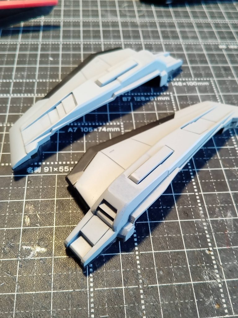 【ウイング改修】スラスターと吸気ダクトの簡略化されたディテールを良くする。本体との接続ジョインが短いためウイングとの空間が無さすぎ、角度などの可動ができないのを改修。