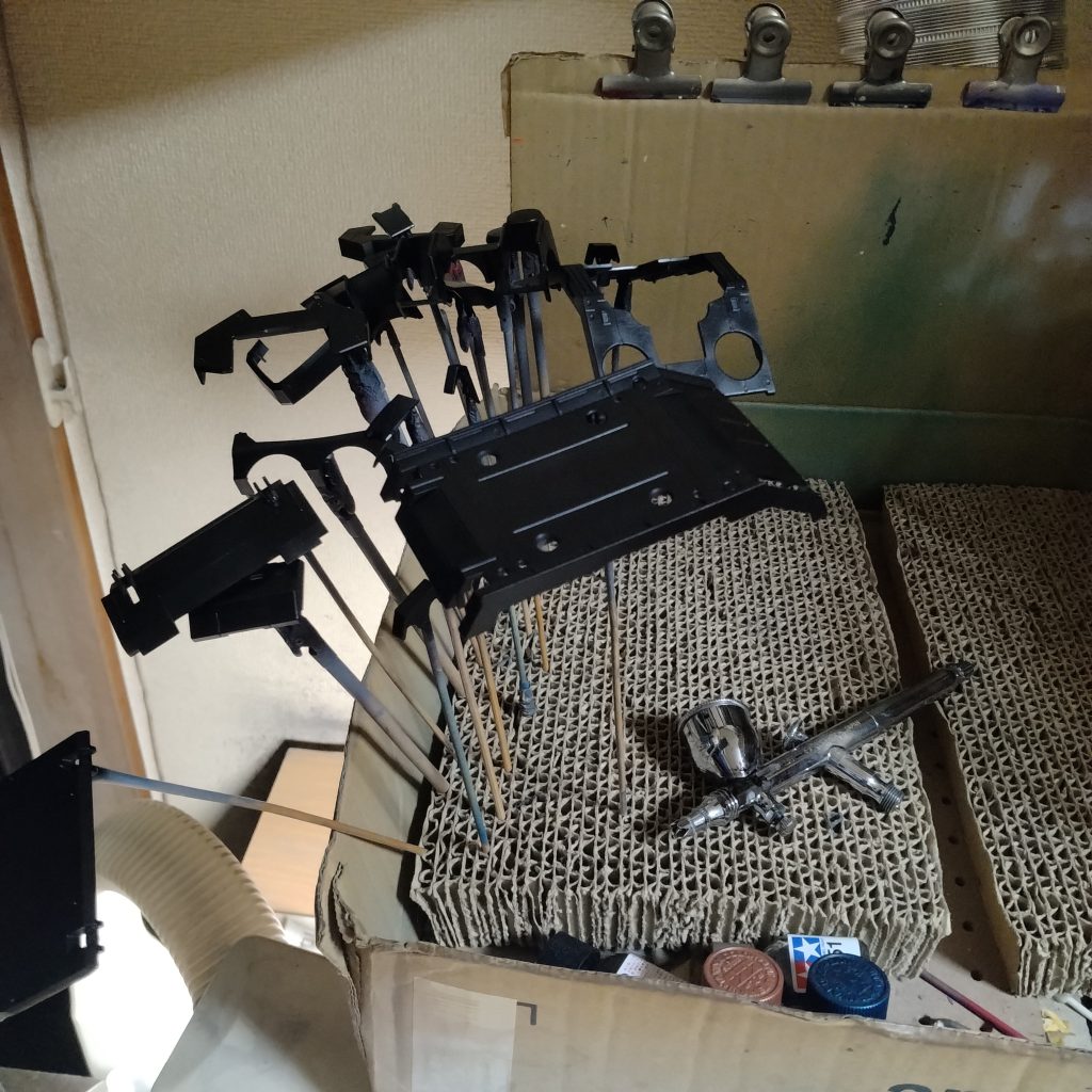 先ほどの青、赤、黄、を黒に吹かしました!ちなみに白は黒立ち上げにはしません!ここまではハンドピース0.3を使ってます!これからグラデーションの色を入れていくのですが!ハンドピースは0.2に変えます!私は0.3はクレオスのプラチナで0.2はタミヤのスーパーファインを使ってます!(笑)ちなみにですが!クレオスのプラチナは長く使いはしてるのですが!さほど気に入ってる訳じゃ無いんですよ!(笑)エアー調整とか付いてますが!いつも全開にしていて!エアー調整は自分で付けてる手元のバルブで常にしてます!圧の調整はコンプレッサーでしてますが圧力はわりと高めに設定していて!ほぼ手元のエアーで吹かし加減をしてます!(笑)
