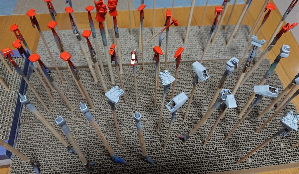 武器の作成と並行して、形になったパーツから塗装も開始。塗装棒が刺さっているのが、100均ダイソーの猫の爪研ぎダンボールなのはご愛嬌。