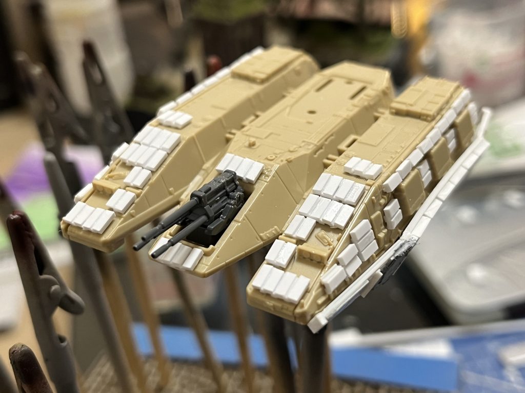 マゼラアタックの増加装甲を加工中です。小さなタイル状態のものは爆発反応装甲(EAR)。側面の分厚い板は同じく反応装甲(TUSK)。格子状のものはRPG対策のスラットアーマーです。EARの切り出しと設置は地味で根気のいる作業です。先日購入したArmor Modellingを横目に理想の形に仕上げつつあります。両側のシャーシ上部にこれからカーゴデッキを設置するつもりです。そのデッキに装備品を載せたり、くたびれた兵士をタンクデサントさせます。後部ハッチは解放状態に加工します。「生き残る戦車の凄み」…ミリタリテイスト満載のマゼラになると思いますよ( ^_^)/~~~