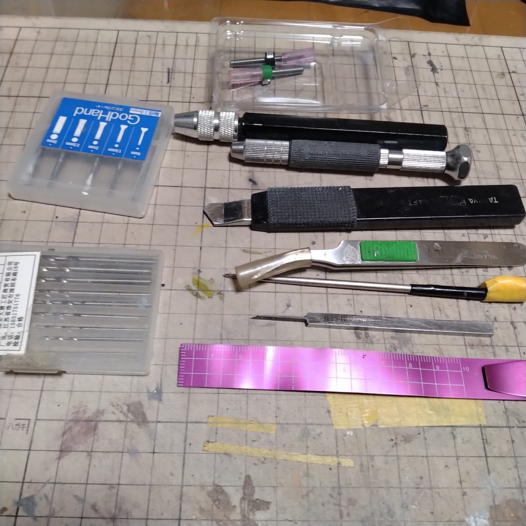 スジ彫り前にちょっと休憩です!(笑)前にも書いた気もしますが!長い事私は高価な道具を使って製作してません!(笑)ちょっと載せますね!(笑)基本は0.15で一度掘ってから物に合わせて0.2か0.3で軽く掘り直してます!0.15も2千円弱の物で0.2と0.3はそろそろかなと言う時に同じ物を買い直して使ってます!これも安い物です!(笑)スピンブレードはゴッドハンドの物です!罫書き針は研ぎながら長い事使ってます!(笑)ドリルも揃いの安物ですが!これも凄く長く使ってます!定規はアルミの物で測る時に形状に合わせて曲げまくってます!(笑)これは100均の物です!安価でアルミなので!気兼ね無く曲げれて凄く便利で!実は凄く良い仕事する一品です!(笑)前に道具を載せた時に喜んでくれた方がいたので!載せてみました!安物ばかりで!ホントは載せるの凄く恥ずかしいのですが(笑)用途は高価な物と同じなので!使い方次第ですよね!(笑)ちなみにガイドテープも色々使った結果こればかり使ってます!これも安い方の部類だと思います!決め手は粘着力です!ただ剥がした後にノリが残る事が多いので!洗浄後に更に軽くエナメル溶剤で残ったノリ跡を拭き取ってます!ちょっと寄り道投稿でした!もう少ししたらスジ彫りやって行きます!