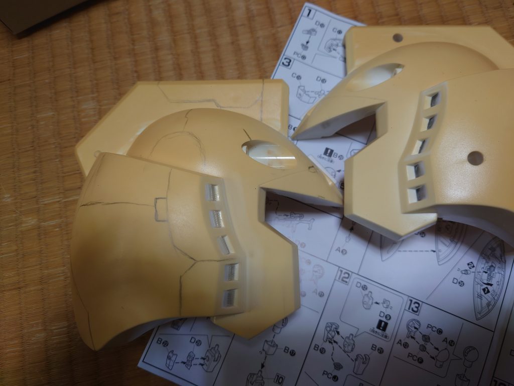 前回制作中だったデカイ頭「ガンダムフラッシュサウンドヘッド」っていうやつみたいです…コヤツの改修を頼まれたのですが…まぁ硬い異様に硬い…とりあえず塗膜だけとって面処理しようとヤスリかけてみるも対して削れない( ߹꒳߹ )