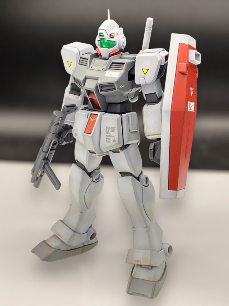 寒ジムは素組で塗装のみのつもりだったのですが、古いHGだけあってあまりに大根役者なので、ボディや肩にボールジョイントを仕込んで動作を改善、今時のキットに近い体全体を使った自然なポーズが取れるようになりました😃