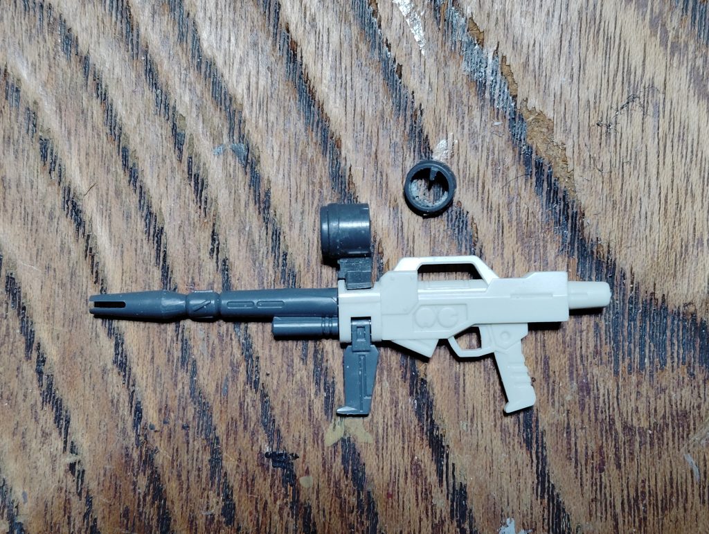 スコープは当初ガンダムのビームライフルからそのまま移植しようかと考えていましたが、無傷のビームライフルをパーツ取りの犠牲にするのが忍びなく思えたので、以前東京は秋葉原で弾倉目当てで買ったバラ売りのサイコ・ザクのバズーカから移植しました。
