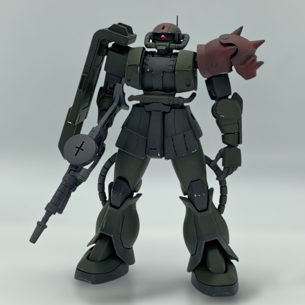 見切れる程度なので普通のザクでいいかと思ったのですが、違和感が半端ない😓 色で大分変わると思うものの、手持ちのザクを塗り替えたら後で困ること必至なので、撃ち抜かれた頭や真っ二つにされた胴等にパーツ提供したリバイブ版とジャンクパーツを貼り合わせ、ワンデイ工作ででっち上げました。復讐のレクイエム追体験のようで楽しかったです😃