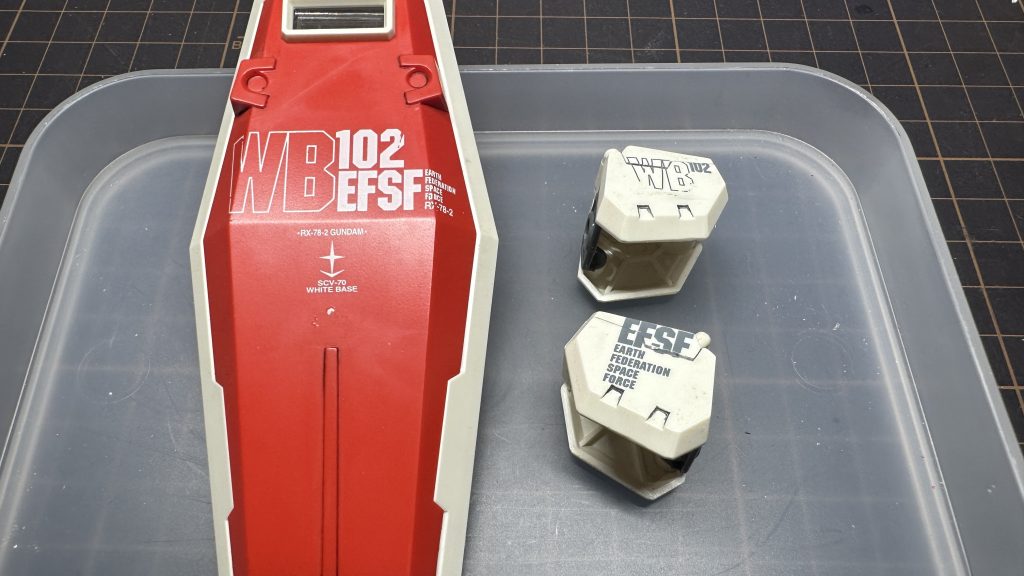 ドライデカールなので爪で擦ってもある程度は剥がれたが大変だし傷もつきそうなので試しにプラ素材OKのパーツクリーナーを吹き付けたウエスで擦りとってみたところ比較的綺麗に落ちた。