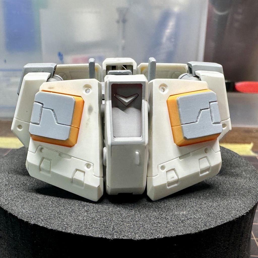 前回穴埋めに失敗したヘリウムコアはプラ板貼り付けて何とかカバーできました。スジボリには一部C面を設けたり太さを変えたりと情報量を増やしています。ヘリウムコアの四角く掘った部分は全体にC面を入れて別パーツっぽくなるようにしてみました。