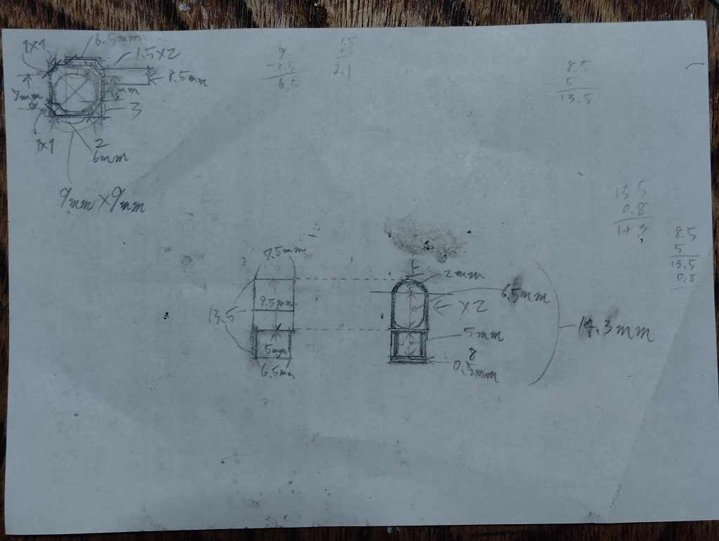 改修のために必要なパーツをプラ板などでスクラッチしていくのですが、前回投稿した「ザクⅠ(ランバ・ラル機)」の大型ヒートホークと同様、まずは設計図を引いていきます。
