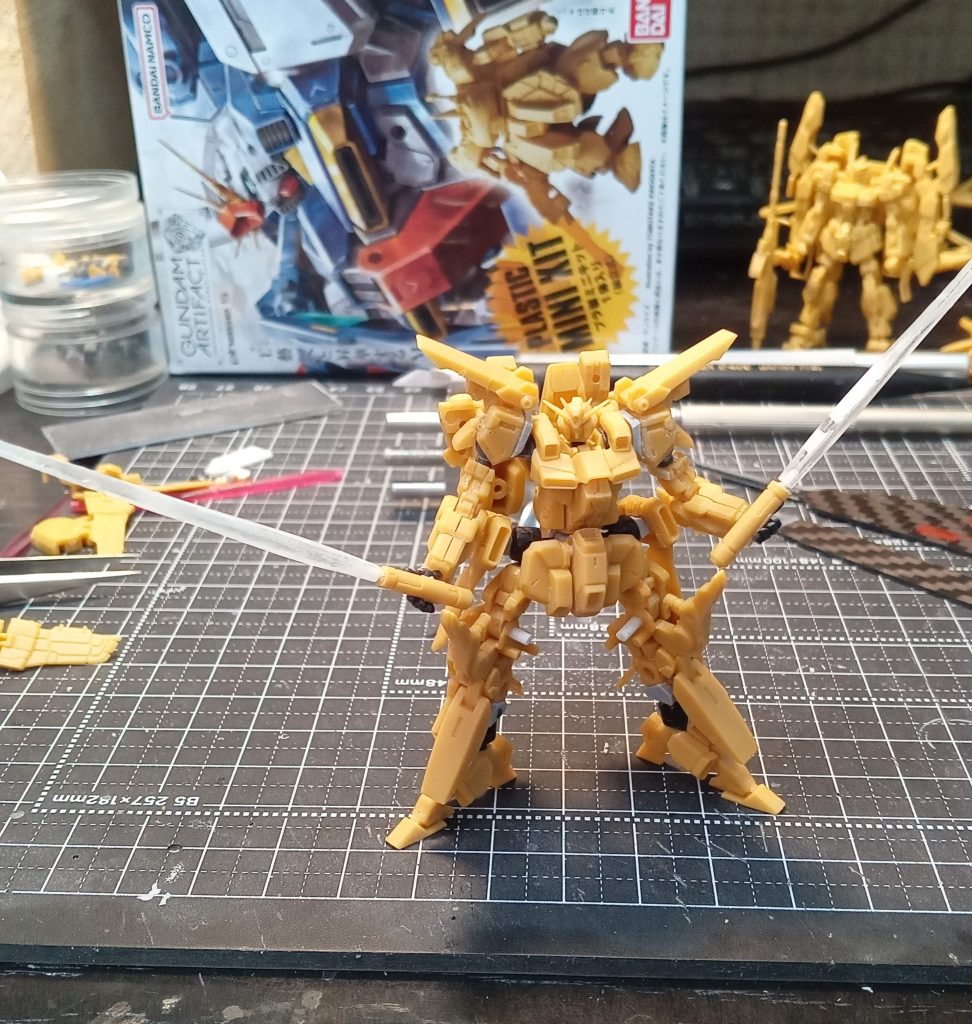 ビーム部分は、ハイコンプロという昔の可動フィギュアのビームサーベルがサイズ的に良かったのでお湯まるUVレジン複製で2本つくり、ビーム部分をカットして、ダボ穴あける。