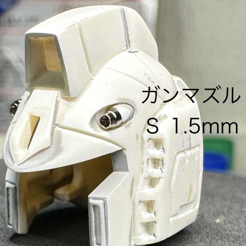 そして頭部バルカンには同じくハイキューパーツのEZガンマズルショートを使用。ショートの1.5mmを買いましたがもっと太くてもよかったかも。取り付けの基部も削り込んでもっと奥まで差し込めたらいいかなと思いつつとりあえずはって感じです。