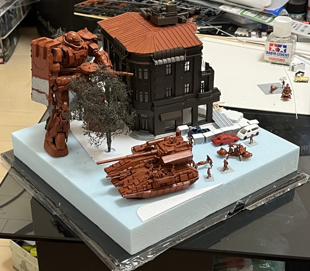 ジオラマベースのサイズが決まりまして、それぞれの配置を確認しました。やっとジオラマらしくなってきましたよ!サイズは前作の「嵐の中で輝いて」と同じです。脳内では映画「ブラックホークダウン」の戦闘シーンがローテーション中です。あれも負傷兵を抱えながらソマリアの市街地を駆けずり回る撤退戦でした。歩道と車道の区切りも終わりました(その区切りを決めるだけでもかなり考え込む…)街路樹も植え込み完了し、歩道脇に数珠繋ぎに並んだゴミ収集BOXも配置してみました。車道のアスファルト仕上げはスタイロフォームのテクスチャーをそのまま活かして上からタミヤの情景テクスチャーペイントを塗ったらどうなるかなと思ってます(なるべく楽したい…)。瓦礫片はこれからもっと追加して行きます。ワッパの配置はまだ気に入らず、もっと躍動感と緊張感がある感じにしたいです。建物内の作り込みもまだ不十分です…