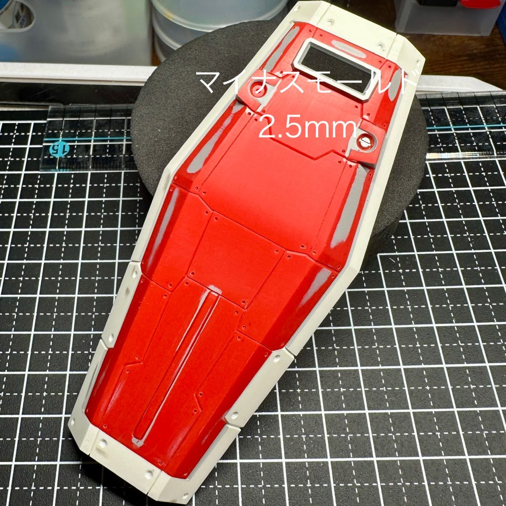まずシールドですが頑張りました。写真で伝わるかわかりませんがパネルの全ての角に0.7mmで穿孔しました。ここには0.7mmのスチールボールを入れるつもりです。また外側のフレームは1.0mmで加工し、元々あるマイナスモールドのディティールは削り落として2.5mmのメタルパーツのマイナスモールドを埋め込めるようにしています。
