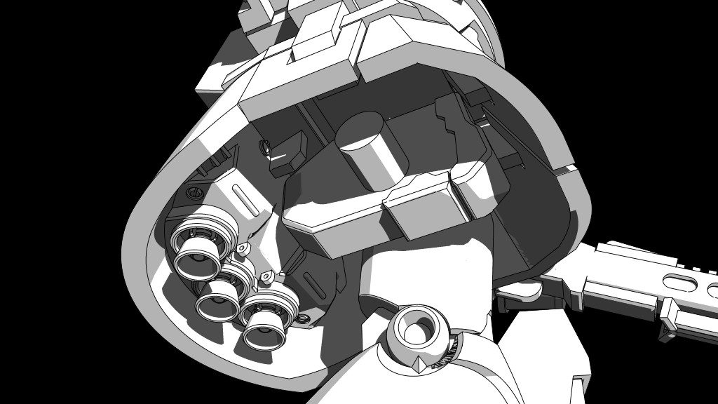 多分この機種がリリースされたタイミングは、ガンダムの出現に慌てたものの、携帯ビーム砲に対抗できる素材は無いし。せめて重装甲とそれを機動力落さずに動かすためにスラスターお化けにするしかなかったんじゃないかなぁ…と。工業機械的に無骨に表現するとこうなりました(*’ω’*)