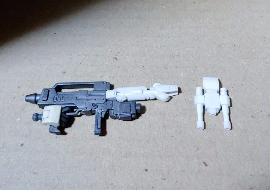 後は盾の裏側に装備する二連装マシンキャノンをランナーとプラ材で造ってみました。もう少しディテール加えるつもりですが小さな物の組み合わせなので中々疲れました。